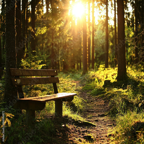 © Prachya, Fototapeta premium Golden sunlight streams through a tranquil forest, illuminating a vacant wooden bench beside a winding path