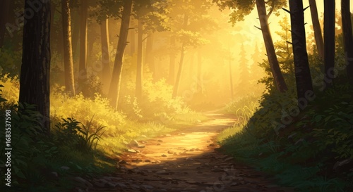 Naklejka premium Golden sunlight streams through a tranquil forest path, illuminating the lush...