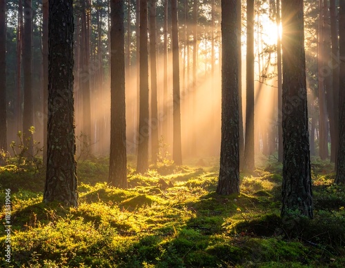 Fototapeta premium Golden sunlight streams through a vibrant forest, illuminating mossy ground...