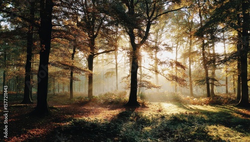 © Muhammad, Obraz premium Golden sunlight streams through autumn forest