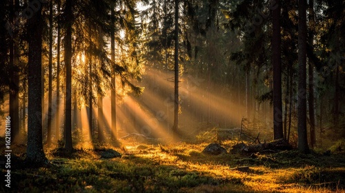 Obraz premium Golden sunlight streams through misty forest