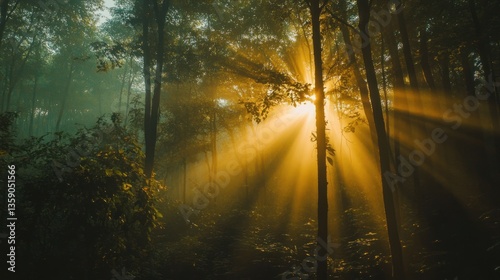 © avila, Naklejka premium Golden sunlight streams through misty forest canopy