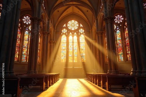 Fototapeta premium Golden sunlight streams through stained-glass windows, illuminating a majestic cathedral interior, signifying divine grace and spiritual purity , christ, sanctuary, belief
