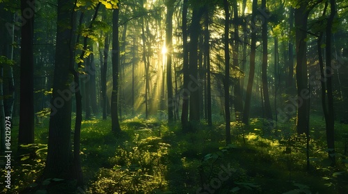 © waqas, Obraz premium Golden Sunlight Through Forest Trees