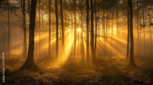 Fototapeta premium Golden Sunlight Through Forest Trees at Sunrise