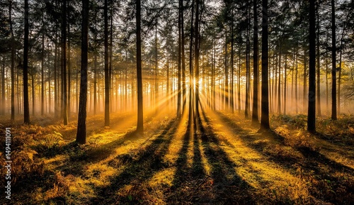 Fototapeta premium Golden Sunlight Through Misty Forest