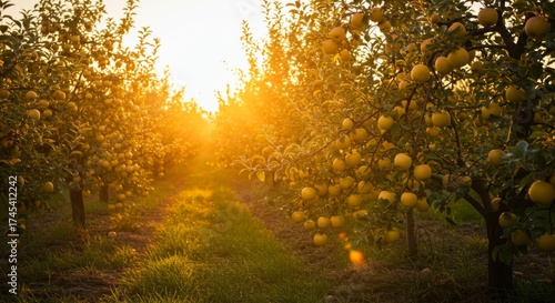 © SweaterWeather, Fototapeta premium Golden Sunlight Through Orchard with Ripe Apples on Trees and Green Grass