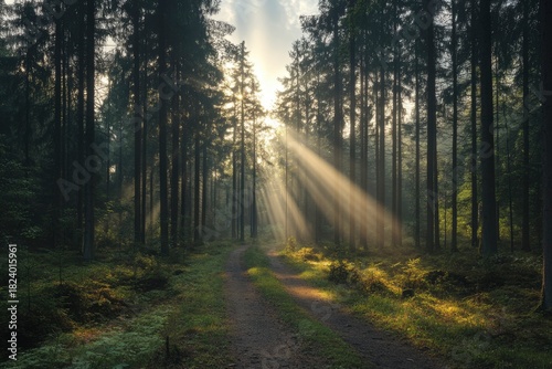 © Dennis, Obraz premium Golden sunlight through tree canopy