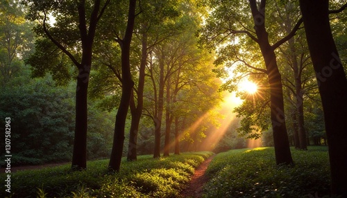 © Mityarko, Obraz premium Golden Sunlit Forest Path Inviting Exploration