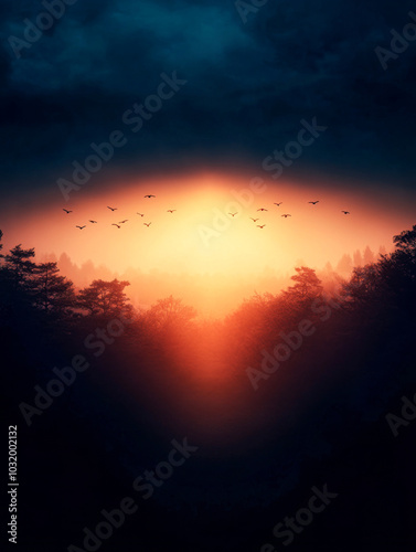 © Chari, Fototapeta premium Golden sunrise breaking through the misty forest with birds flying in the soft morning light