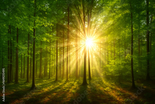 © Fasiha, Obraz premium Golden Sunrise Filtering Through Peaceful Green Forest Trees