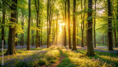 Obraz premium Golden Sunrise Illuminates a Path Through a Lush Spring Forest with Blooming...
