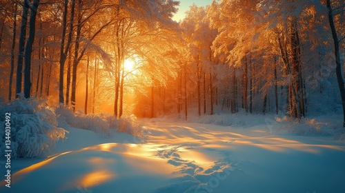 Naklejka premium Golden sunrise illuminates a snow-covered forest path