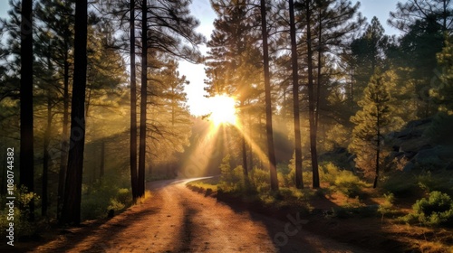 Fototapeta premium Golden Sunrise Illuminates a Tranquil Pine Forest