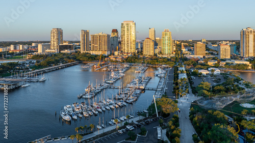 © Red Lemon, Fototapeta premium Golden sunrise illuminates downtown Saint Petersburg, Florida, highlighting boats at the yacht club, waterfront park, and cityscape.