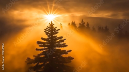 © Mugo, Naklejka premium Golden Sunrise Illuminates Foggy Mountain Conifers