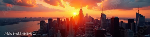 Fototapeta premium Golden sunrise illuminates NYC skyscrapers, East River visible, metropolis,...
