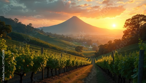 Naklejka premium Golden sunrise illuminates vast vineyard hills leading to majestic volcano...