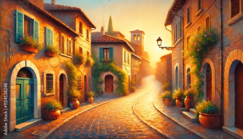 Fototapeta premium Golden sunrise illuminating charming italian village street
