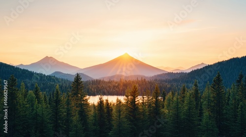 © Arfa_Media, Fototapeta premium Golden sunrise illuminating majestic mountain peak over serene lake and pine forest