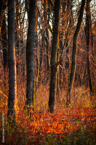 Fototapeta premium Golden sunrise in the autumn forest,leaves on the ground,landscape with trees, golden and orange colors, sunlights through the trees.Branches without leaves,golden forest, autumn season .