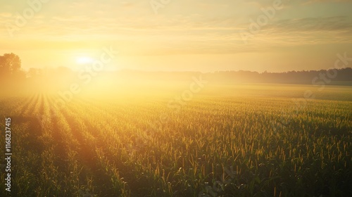 Obraz premium Golden Sunrise Over A Misty Cornfield