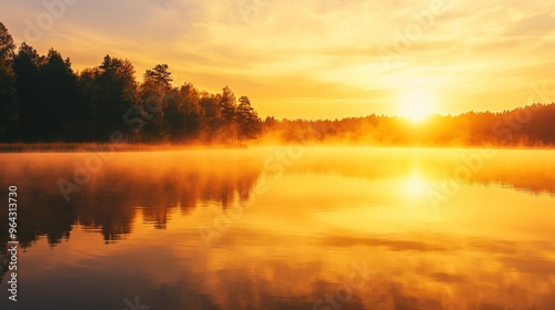 © luck, Fototapeta premium Golden Sunrise Over a Misty Lake