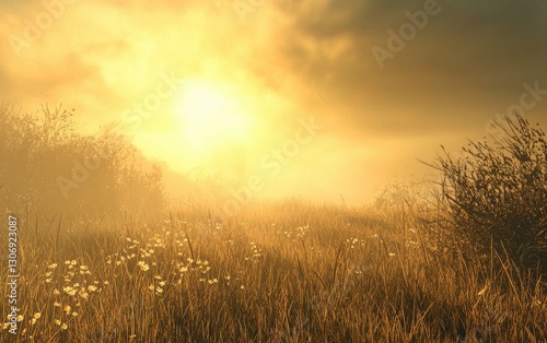 Obraz premium Golden Sunrise Over A Misty Spring Field