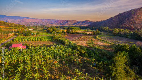© Narong Niemhom, Naklejka premium Golden Sunrise Over a Serene Okra Plantation An expansive okra field stretches across the rural landscape, illuminated by the golden glow of the rising sun. The plants glisten with morning dew