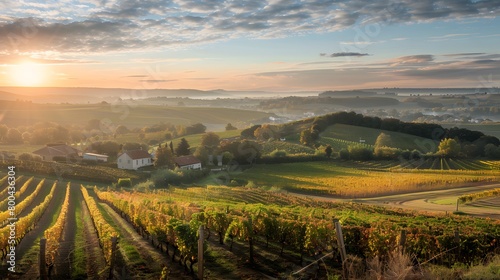 Naklejka premium Golden sunrise over a serene vineyard landscape