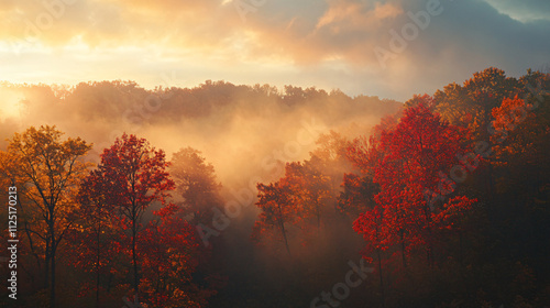Fototapeta premium Golden sunrise over autumn trees in misty forest with vibrant red and orange leaves