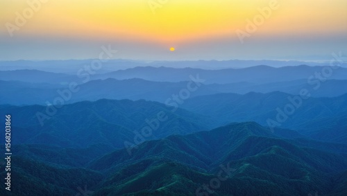 Obraz premium Golden sunrise over blue mountain layers mountains