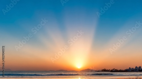Fototapeta premium Golden sunrise over calm ocean waters with wide soft rays spreading across...