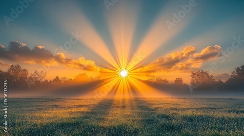 © RizalAziz, Obraz premium Golden Sunrise Over Field With Trees In The Horizon Peaceful Landscape