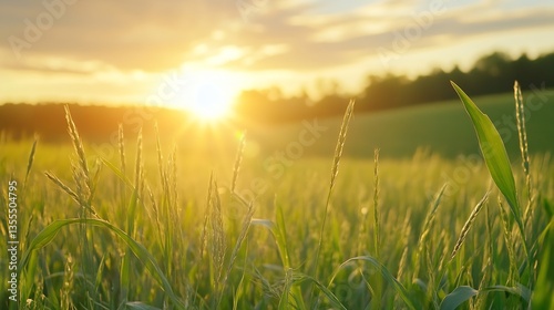 Fototapeta premium Golden Sunrise Over Lush Green Fields with Soft Sunlight and Dew : Generative AI