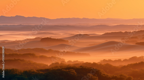 © Nataliya, Fototapeta premium Golden Sunrise over Misty Hills in Autumn Serenity