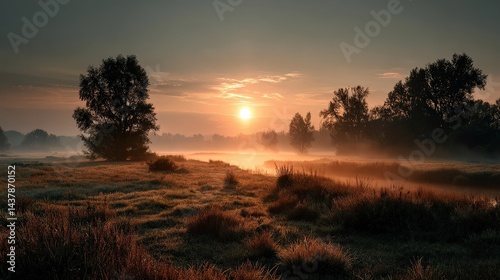 © Kitsada, Obraz premium Golden sunrise over misty meadow landscape photography natural environment aerial view serene atmosphere
