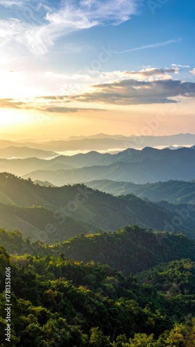 © Udin, Fototapeta premium Golden sunrise over misty mountain ranges and lush, forested valleys