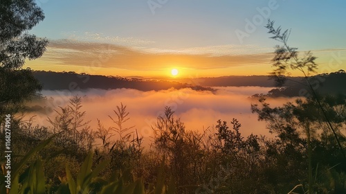 Obraz premium Golden sunrise over misty mountains with soft pastel colors blending into the...
