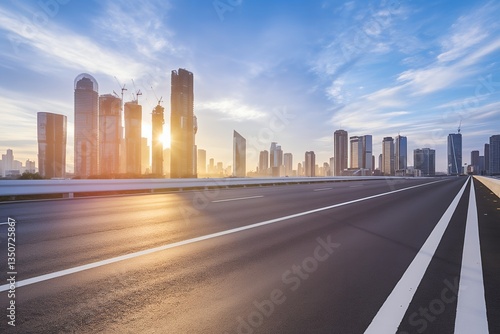 © Thanh, Obraz premium Golden Sunrise Over Modern Cityscape with Skyscrapers