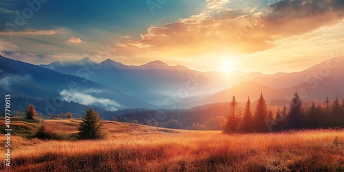 Obraz premium Golden Sunrise Over Mountain Range With Fog And Forest