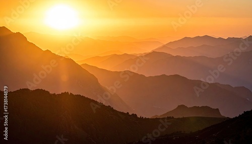 Fototapeta premium Golden Sunrise Over Mountain Range with Warm Hues and Layers of Peaks in Silhouette Under Bright Sunlight in a Scenic Landscape Panorama