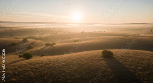 © Xioo, Fototapeta premium Golden Sunrise Over Rolling Hills Misty Morning Landscape.