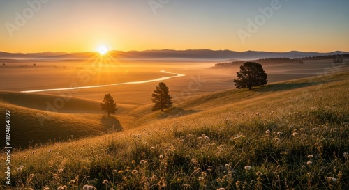© joo, Obraz premium Golden sunrise over rolling hills with trees and misty landscape