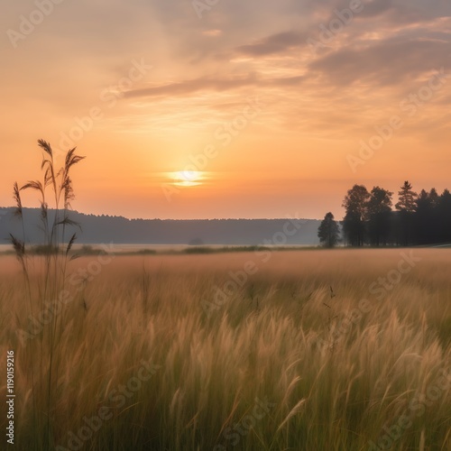 Obraz premium Golden Sunrise Over Serene Grassland Field