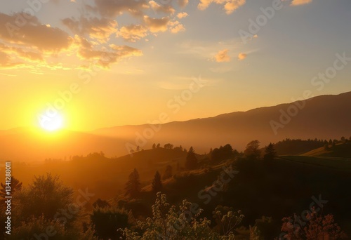 Fototapeta premium Golden sunrise over serene landscape, symbolizing enlightenment, judgement,...