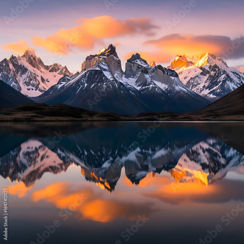 © name, Obraz premium Golden Sunrise over Snow-Capped Peaks Reflected in a Patagonian Lake