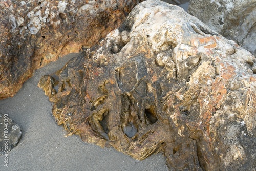 © Wirestock, Naklejka premium Golden sunrise over the sea waves with stones on the water