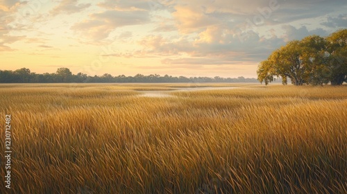 Fototapeta premium Golden sunrise over tranquil marsh landscape.