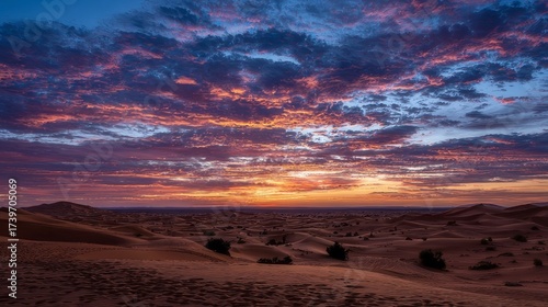© Nasreen, Obraz premium Golden sunrise over vast rolling sand dunes in the sahara desert, morocco with warm glowing sky and natural desert landscape